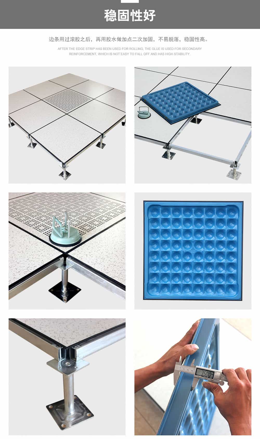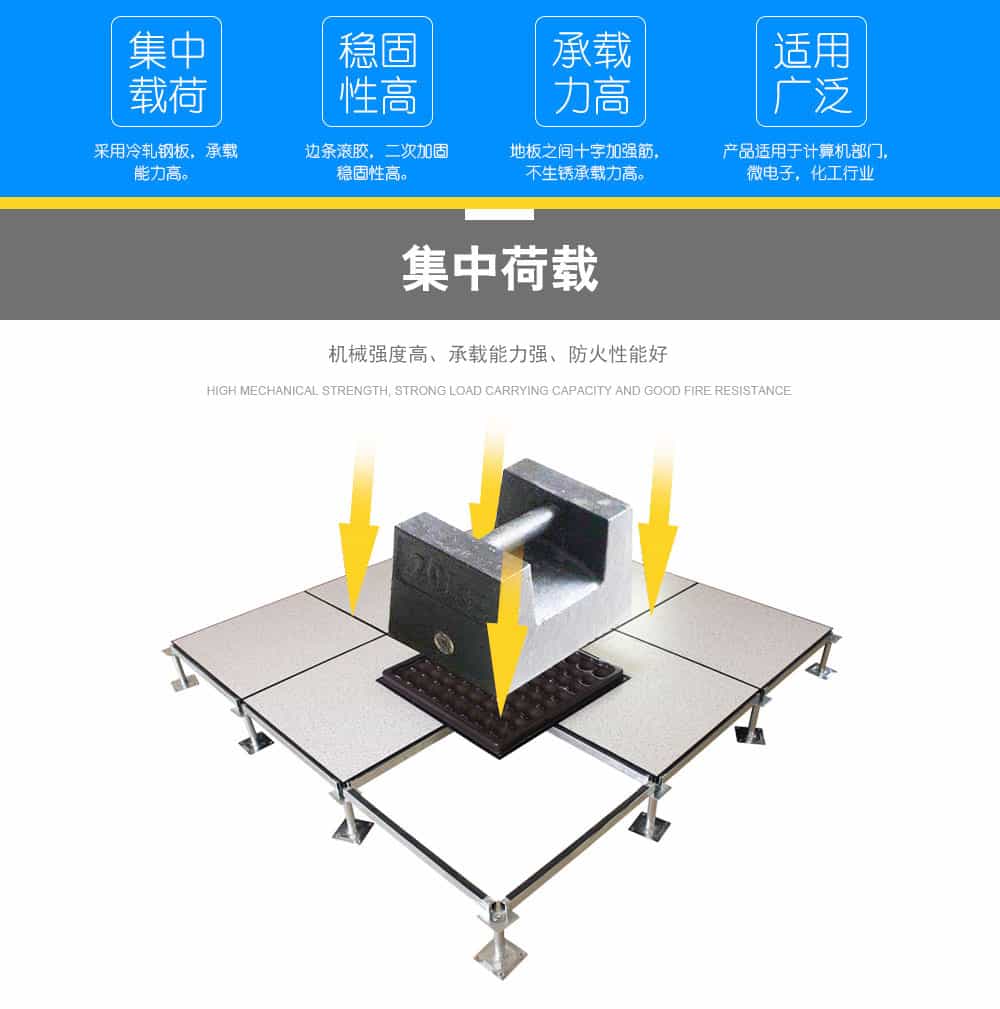 全鋼防靜電地板為全鋼組件,分有邊、無邊、微邊(三種邊處理方式)。底面采用SPCC深沖冷軋板拉伸成型鋼板厚度(0.4~1.5mm),球窩狀結(jié)構(gòu),增加地板的機械荷載強度。面板采用硬質(zhì)SPCC鋼板(0.5~2.0mm),上下經(jīng)過點焊焊接成型,切邊沖孔后,經(jīng)防銹處理,環(huán)氧樹脂粉末靜電噴涂后,中間填充發(fā)泡水泥(可以根據(jù)客戶需求發(fā)泡不同重量),再經(jīng)過日曬養(yǎng)護后形成穩(wěn)定的承載結(jié)構(gòu)。地板上表層粘貼防火板(HPL)/復(fù)合PVC/ 通體PVC/陶瓷地磚等不同材質(zhì)的裝飾表層,達到產(chǎn)品花色的多樣性、可以根據(jù)客戶需求個性化定制產(chǎn)品。搭配聯(lián)網(wǎng)支架、支架、螺釘組裝后,定位聯(lián)接更加準(zhǔn)確、精度可靠。